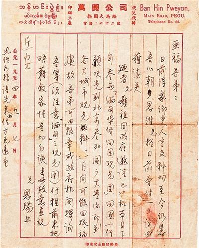 ——摘选自1954年9月7日福建泉州籍缅甸华侨李恩赐写给弟弟的家书
