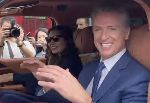 2023年10月,加州州长纽森在深圳试驾比亚迪电动汽车,桑切斯(左)当时是他的州长办公室高级气候顾问。深圳卫视深视新闻