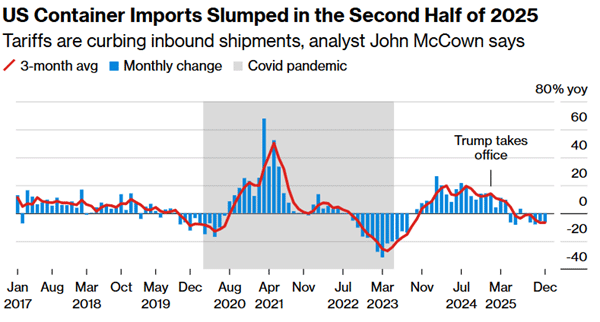 彭博社31日报道称,根据航运业分析师对美国十大港口的统计,2025年末美国集装箱进口量出现连续四个月下滑,且随着贸易流向转向其他经济体以规避特朗普政府的关税政策,这一趋势在2026年大概率延续。