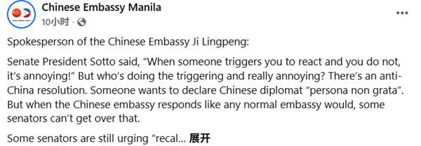 中国驻马尼拉大使馆在社交媒体发布的最新声明中直指,部分菲参议员一再玩弄老旧把戏,接连抛出反华决议,企图将中国外交官列为所谓“不受欢迎的人”,纯属主动挑衅、虚张声势、装腔作势,这种做法根本吓不倒任何人。