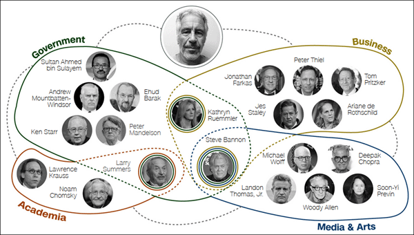 随着案情不断被揭露,史蒂夫·班农(Steve Bannon,前特朗普首席策略师)、迪帕克·乔普拉(Deepak Chopra,作家)、拉里·萨默斯(Larry Summers,美国前财政部长、哈佛大学前校长)、英国安德鲁王子(Andrew Mountbatten- Windsor,已被剥夺头衔)、挪威王储妃梅特-玛丽特(Mette-Marit),以及一众金融巨头,也都被牵扯进爱泼斯坦的关系网中。