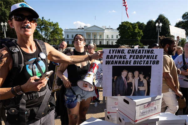 2025年9月2日,美国华盛顿特区,美国国会山前爆发反特朗普示威游行。反特朗普抗议者们高举示威标语,要求公开爱泼斯坦案机密文档。 IC Photo