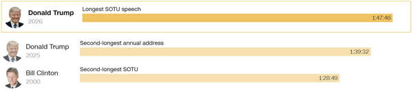 据美媒报道,特朗普当天在讲话中提及了边境安全、移民、经济和犯罪问题等议题。根据加州大学圣塔芭芭拉分校美国总统项目的统计,这场国情咨文时长约1小时48分钟,创下至少1964年以来美国总统在国会发言的最长记录。