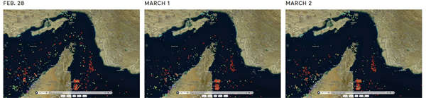 2月28日至3月2日,霍尔木兹海峡的航运放缓对比。NPR截图
