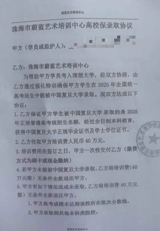 一位家长出示的《珠海市蔚蓝艺术培训中心高校保录取协议》显示,为帮助甲方学员考入理想大学,经双方协商,由乙方(机构)通过强化特训确保甲方学生在2025年全国统一高考招生中能被中国复旦大学录取。培训费为40万元,如果未被录取,乙方承诺无条件退款。