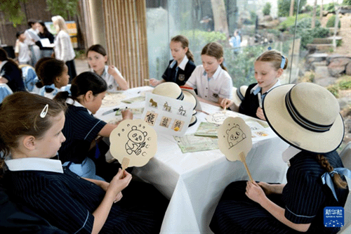 4月2日,在澳大利亚阿德莱德动物园举办的“国际中文日”活动中,来自当地学校的学生书写汉字“熊猫”并绘画。(图源:新华社)