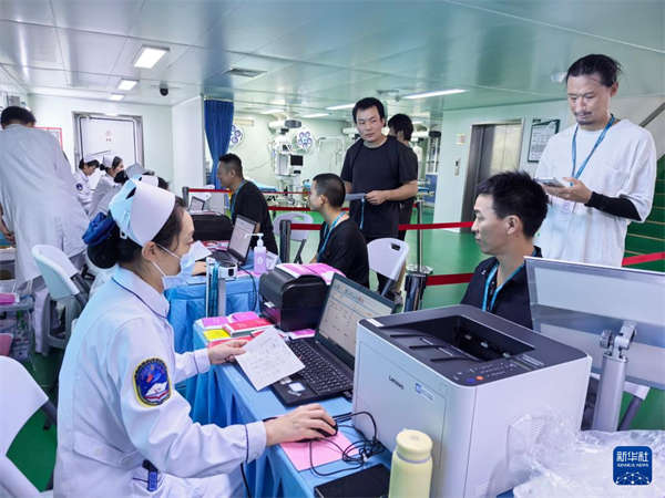 12月20日,执行“和谐使命-2025”任务的中国海军“丝路方舟”号医院船抵达巴巴多斯布里奇敦港。这是医院船挂号处分诊现场。