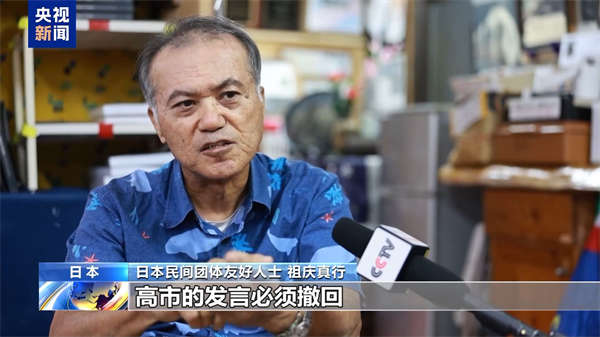 日本民间团体友好人士 祖庆真行:高市的发言必须撤回,回到和平与日中友好的道路上来,希望她立即下台,太危险了,不知道会做出什么事情。我认为高市不是口误,而是她从根本上就有这种想法,在不经意间流露出来了,从某种意义可以说是“终于说出来了”,说明她对曾经的侵略战争根本没有反省。