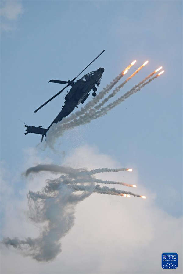 2月1日,在新加坡樟宜展览中心举行的新加坡航展媒体预演上,一架新加坡空军阿帕奇AH-64D直升机进行飞行表演。