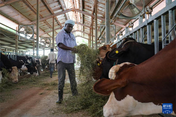 7月18日,在毛里塔尼亚伊迪尼村,中国援毛里塔尼亚畜牧业技术示范中心专家检查牛群的进食和生长情况。