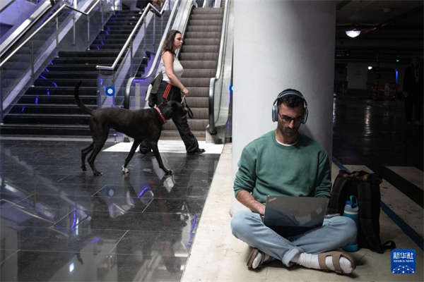 3月11日,在以色列特拉维夫,防空警报响起时,一名男子在一处大型公共民防设施内避难时继续工作。