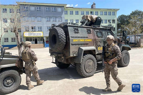 4月14日,在土耳其东南部尚勒乌尔法省的一所中学,警方调派装甲车辆加强保卫。新华社发(穆斯塔法·卡亚摄)