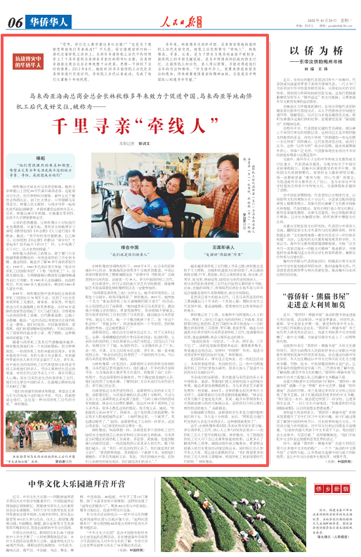 去年,由林秋雅和黄田园、李尧庆等专家学者主编,多位南侨机工后代、热心人士参与的《再会南洋——南侨机工后人千里寻亲路》出版。林秋雅说,为了鼓励南侨机工后人写下自己先辈和家庭的故事,让更多人了解南侨机工故事,她推动组织成立编委会,希望将这段感人的历史更加生动地呈现出来,同时昭示后人和平来之不易、莫让战火重燃的宗旨。“我们希望更多南侨机工后人传承父辈精神,将南侨机工的家国情怀代代相传。”林秋雅说。(记者 彭训文)