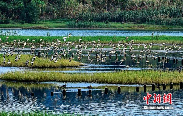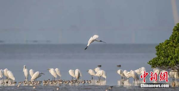 “顶流明星”黑脸琵鹭(上)与白鹭等水鸟。鹿向荣 摄