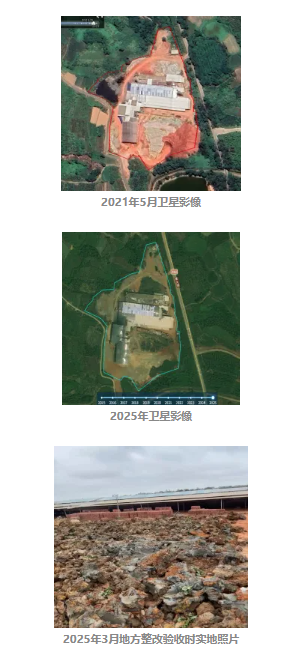 2023年4月,督察指出澄迈长丰节能建材有限公司违法占用澄迈县大丰镇华侨农场土地64.03亩(永久基本农田47.53亩)建设砖厂问题。2025年9月督察发现,该公司未拆除复耕、恢复种植条件,在露天堆放的黏土和钢架厂房内简单平整插种番薯苗,虚假整改。省、县两级认定问题已完成整改并验收通过。