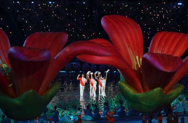 2025年11月9日,第十五届全国运动会开幕式在广东奥林匹克体育中心举行。图为开幕式上火炬手交接火炬。 中新社记者 盛佳鹏 摄