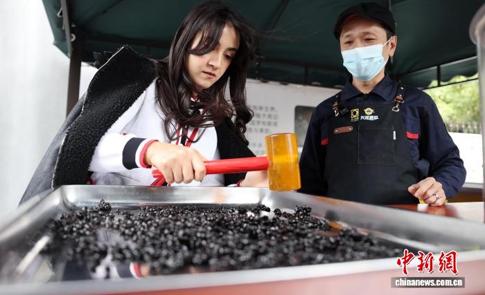 11月27日,中阿卫视主持人、记者阿思玛体验兴隆华侨传统炭烧咖啡焙炒技艺。 陈英清 摄