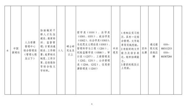 此次招聘涉及6个岗位、计划招聘11人,具体岗位及资格条件详见《中国新闻社2026年度公开招聘岗位信息表》。其中,有关岗位专业条件参考教育部公布的《授予博士、硕士学位和培养研究生的学科、专业目录》。