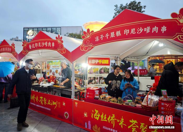 2月28日,“海丝侨味·荟聚五洲”——2026年侨家乐·福建省华侨美食文化交流活动丰泽专场在泉州市建筑服务产业园启动。本届活动以“海丝侨味·荟聚五洲”为主题,精心组织了130多个特色美食展位,既有印尼沙爹、南洋糕点的异域风情,也有闽南润饼、炸醋肉的家乡味道。图为现场各种美食吸引市民购买。中新社记者 吕明 摄