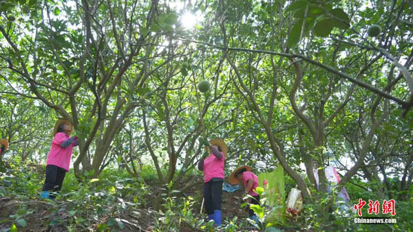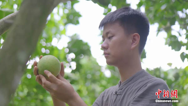 图为全国人大代表、广东茂名化州市培林橘红种植专业合作社社长廖志略采摘化橘红果。化州市化橘红专班 供图