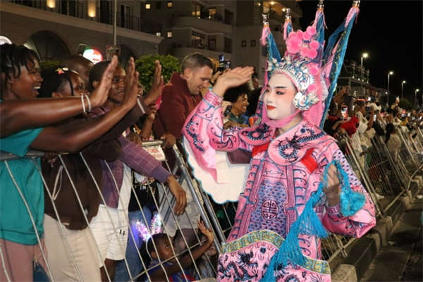 华人戏曲演员与沿途观众击掌。南非开普敦华星艺术团供图