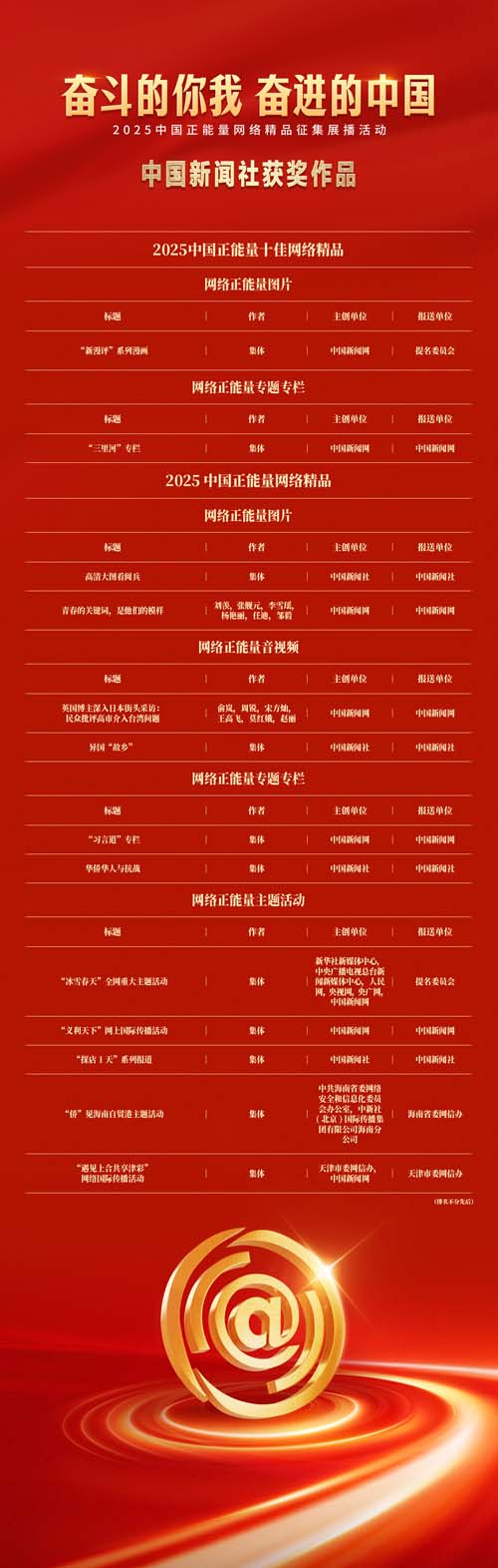 中新社13件入选作品分别为:《“新漫评”系列漫画》《“三里河”专栏》入选2025中国正能量网络正能量十佳网络精品;《高清大图看阅兵》《青春的关键词,是他们的模样》入选2025中国正能量网络精品网络正能量图片;《英国博主深入日本街头采访:民众批评高市介入台湾问题》《异国“故乡”》入选2025中国正能量网络精品网络正能量音视频;《“习言道”专栏》《华侨华人与抗战》入选2025中国正能量网络精品网络正能量专题专栏;《“冰雪春天”全网重大主题活动》《“义利天下”网上国际传播活动》《“探店1天”系列报道》《“侨”见海南自贸港主题活动》《“遇见上合共享津彩”网络国际传播活动》入选2025中国正能量网络精品网络正能量主题活动。