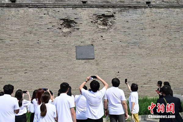 图为在京台港澳⻘年代表参观拍摄宛平城墙体弹坑遗址。中新社记者 ⽥⾬昊 摄