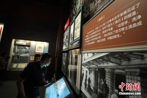 7⽉7⽇,《为了⺠族解放与世界和平》主题展览在位于北京的中国⼈⺠抗⽇战争纪念馆开幕。其中,展览介绍了⾹港《⼤公报》记者的抗战报道。1945年9⽉2⽇,⾹港《⼤公报》记者朱启平亲眼⻅证了“密苏⾥”号上的受降签字仪式。他写下题为《落⽇》的报道,题⽬寓意⽇本法⻄斯政权的灭亡。 中新社记者 蒋启明 摄