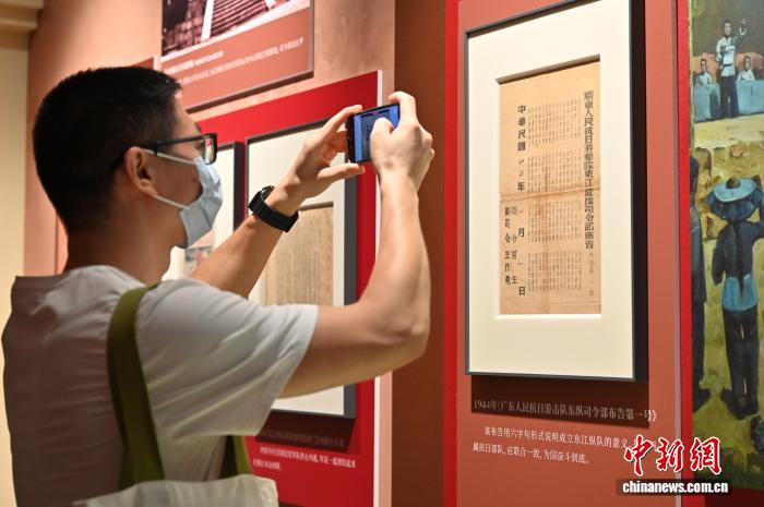 图为《广东人民抗日游击队东江纵队成立宣言》(二级文物)吸引参观者拍摄。中新社记者 陈楚红 摄