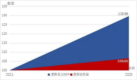 图3 2021-2025年美国名义GDP和发电量的增长幅度(2021年数值=100)笔者自制