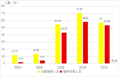2025年,我国出国留学人数超57万,留学回国人数达53.56万。