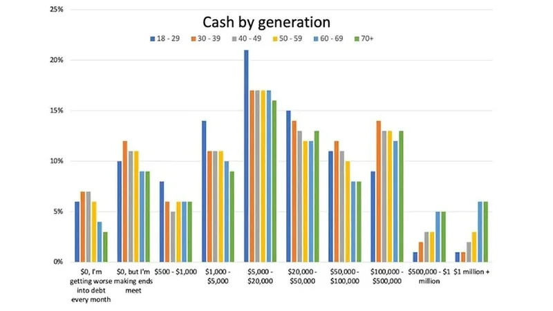 正因如此,拥有存款的人数比例正在持续下降。Great Aussie Debate 调查发现,存款在 20,000 至 50,000 澳元之间的人群比例已从 16% 降至 13%。
