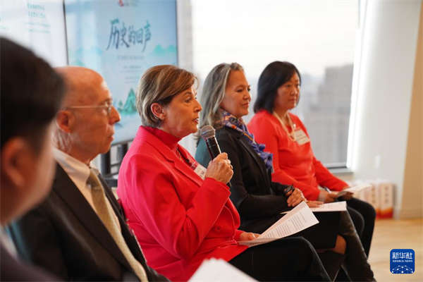 11月25日,在美国纽约举行的2025鼓岭论坛上,陈纳德将军外孙女、美国陈纳德航空军事博物馆馆长内尔·陈纳德·卡洛韦(右三)分享先人与中国人民共同抗战的历史。新华社记者张凤国摄