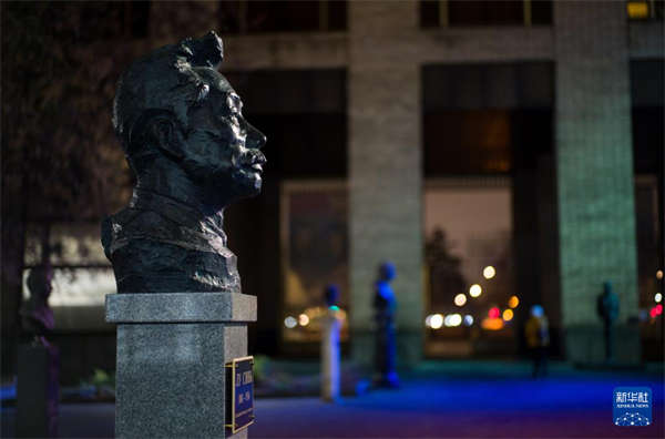 这是12月5日在俄罗斯首都莫斯科全俄外国文学国家图书馆拍摄的鲁迅铜像。新华社记者 郝建伟 摄