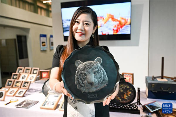 7月7日,在马来西亚吉隆坡,河北省非物质文化遗产郭氏铁板浮雕艺术传承人郭墨涵展示她的作品。新华社记者 程一恒 摄