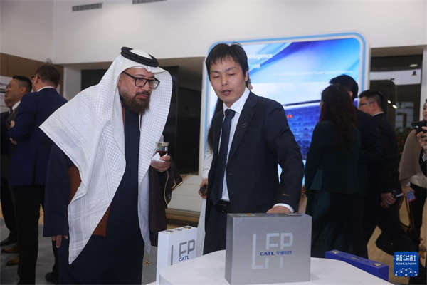 1月10日,在沙特阿拉伯利雅得“宁德”服务体验中心,宁德时代工作人员向沙特阿拉伯工业和矿产资源部首席顾问安巴萨·甘迪勒介绍中国新能源电池产品。新华社发(宁德时代供图)