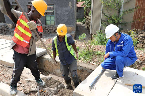 1月21日,在卢旺达北方省布雷拉地区,中国路桥结构工程师周春毅(右)和两名当地工人在由中国路桥和卢本土企业组成的联营体承建的道路升级项目上施工。