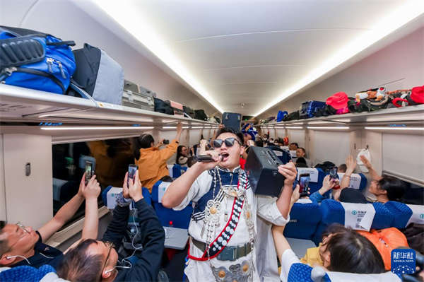 2月4日,歌手在从中国昆明驶向老挝万象的D87次列车上演唱歌曲。新华社发