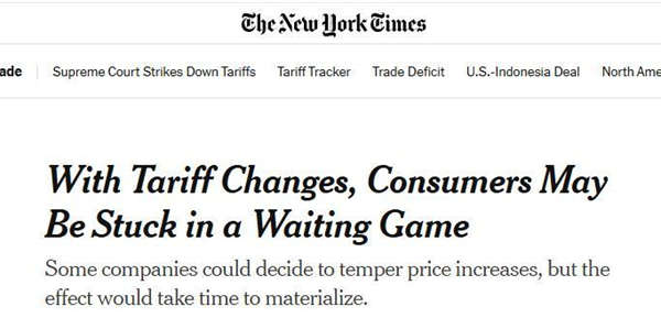 美国《纽约时报》2月20日发表的文章说,美国最高法院否决特朗普政府多项关税的裁决,让消费者们欢欣鼓舞——他们期待进口商品价格能应声下跌。但经济学家警告,商家不会立即调低标价。只要关税政策仍存变数,那些为转嫁成本而涨价的企业必然持观望态度。更棘手的是,就像此前被废除的关税一样,新出台的10%全面关税仍可能被转嫁给消费者。