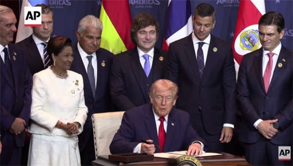 《金融时报》称,在多拉尔,特朗普签署了一项建立“美洲之盾”的宣言,阿根廷、玻利维亚、哥斯达黎加、多米尼加、厄瓜多尔、萨尔瓦多、圭亚那、洪都拉斯、巴拿马、巴拉圭、特立尼达和多巴哥的领导人以及智利当选总统都在他身边。