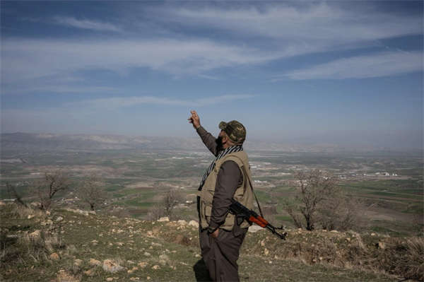 当地时间3月6日,伊拉克苏莱曼尼亚,一名库尔德组织成员望着飞过的飞机。 彭博社