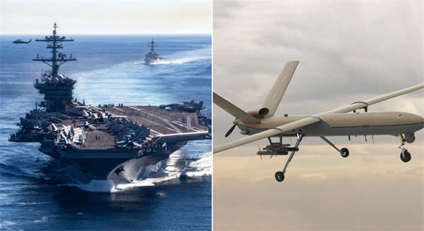 美国“亚伯拉罕·林肯”号航空母舰和伊朗“目击者-129”型无人机 资料图