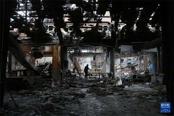 3月28日,在伊朗首都德黑兰,当地居民查看一家损毁的汽车服务中心。