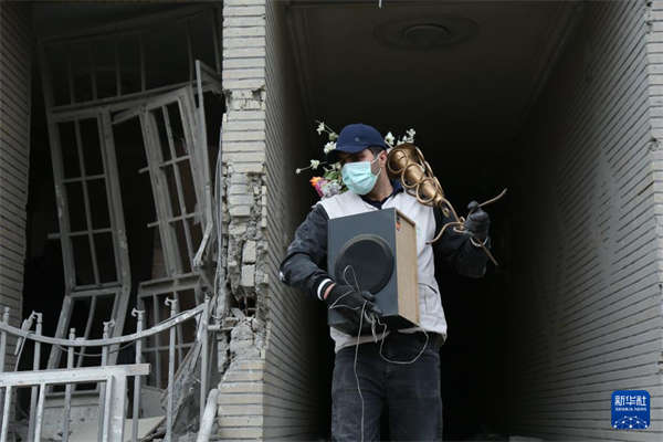 3月12日,在伊朗首都德黑兰东部的一处居民区,一名男子从被毁房屋中搬出物品。