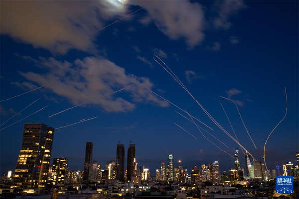 2月28日,在以色列特拉维夫,以军发射防空拦截弹(长时间曝光照片)。