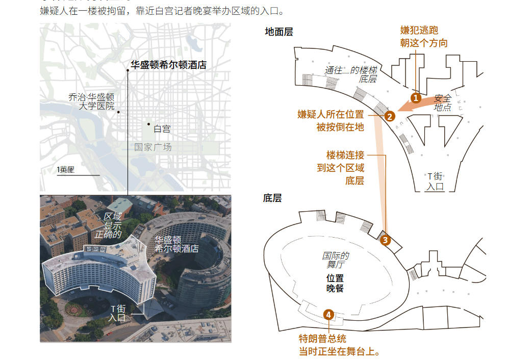 据美媒《华尔街日报》描述,宴会主办地、希尔顿酒店入口处没有设置金属探测器,只有在内部靠近宴会厅的地方才设立了安全警戒线。当晚,枪手冲过安检点,直接冲向特朗普与数百名记者、政府官员和宾客用餐的宴会厅,在与安全部队交火后被逮捕。