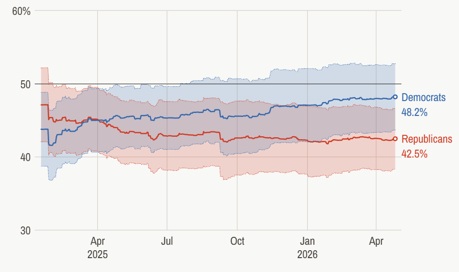 美国《经济学人》指出,在参议院层面,地图本利于共和党,但特朗普受欢迎度下降(尤其是经济议题)使民主党夺回控制权成为现实可能。据预测,民主党胜算约50%。