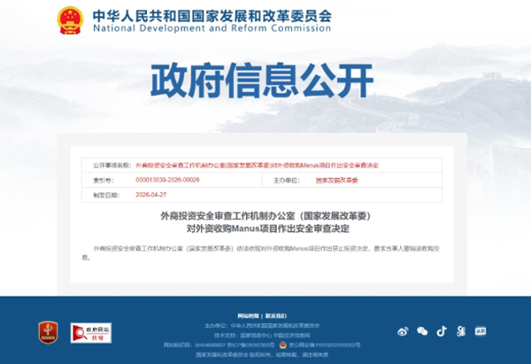 国家发展改革委网站4月27日发消息宣布,外商投资安全审查工作机制办公室(国家发展改革委)依法依规对外资收购Manus项目作出禁止投资决定,要求当事人撤销该收购交易。该决定立即引发外媒热议。英国《金融时报》、美国彭博社等外媒解读说,在中美围绕人工智能(AI)主导权竞争不断升温的背景下,中国做出这一决定是在发出相当强硬的警告。