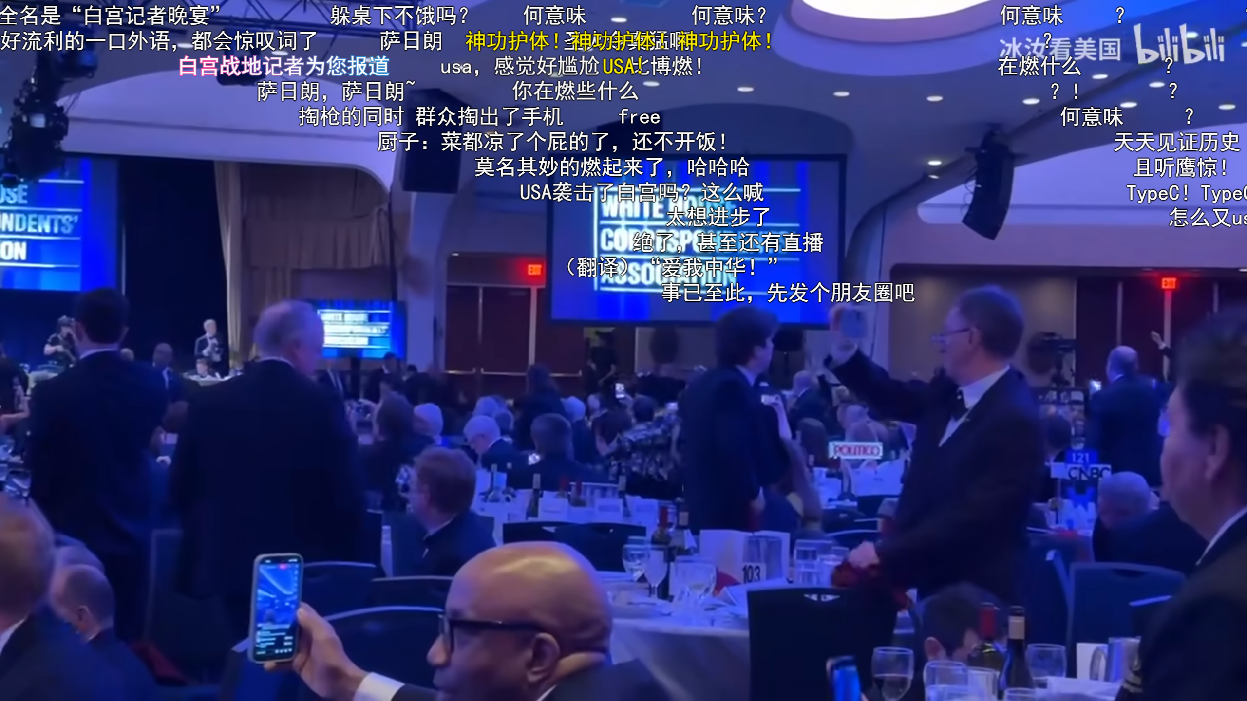 美国东部时间4月25日晚,特朗普在前往华盛顿特区希尔顿酒店出席白宫记者协会年度晚宴时,遭遇一名枪手冲撞安检。特朗普被紧急撤离,2000余名记者来宾直接目睹了这一幕:
