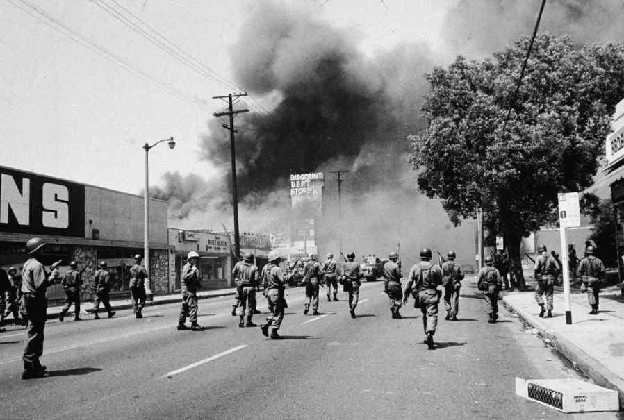 1965年,南洛杉矶地区黑人因警察种族歧视和暴力执法,爆发了声势浩大的瓦茨暴动(如图)。暴动最终被加州第40步兵师镇压,23人被军警击毙;此后为安抚当地愤怒的黑人群众、剥离共产主义者影响,州政府给了他们一些政策优待。CSUDH的建立就是其中之一